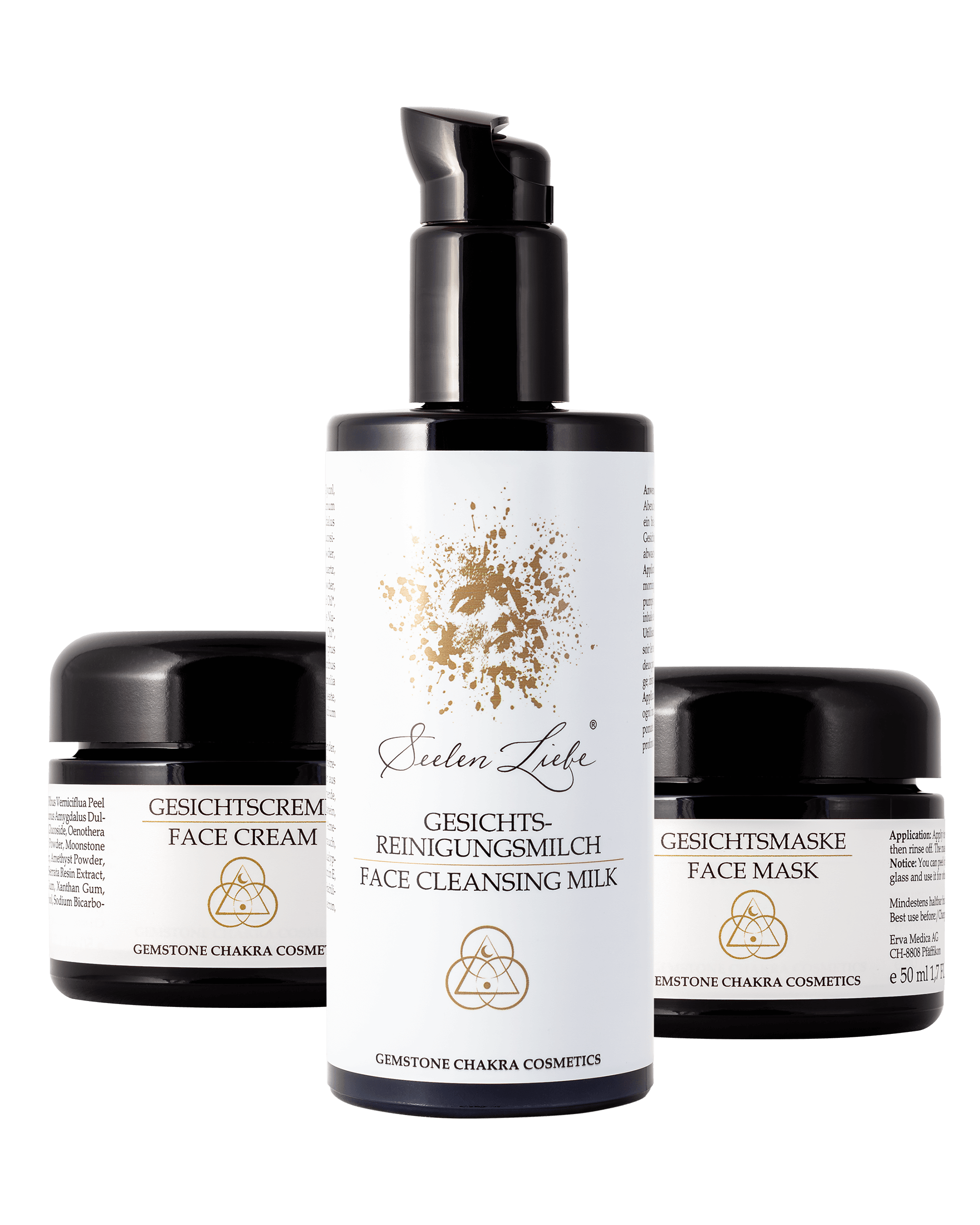 Ein luxuriöses Pflegeerlebnis für Haut, Geist und Seele: Die Gesichtsreinigungsmilch ist mild reinigend mit Lorbeeröl, Weihrauch und Amethyst – für Intuition und sanfte Reinigung. Die Gesichtscreme beinhaltet reichhaltige Pflege, die Herz und Geist öffnet und Wertschätzung für das Wunder Leben schenkt. Zuletzt die Gesichtsmaske, die mit ihren Mineralien und Edelstein-Puder tiefenwirksam reinigen und die Haut nähren – ein wöchentliches Luxusritual.